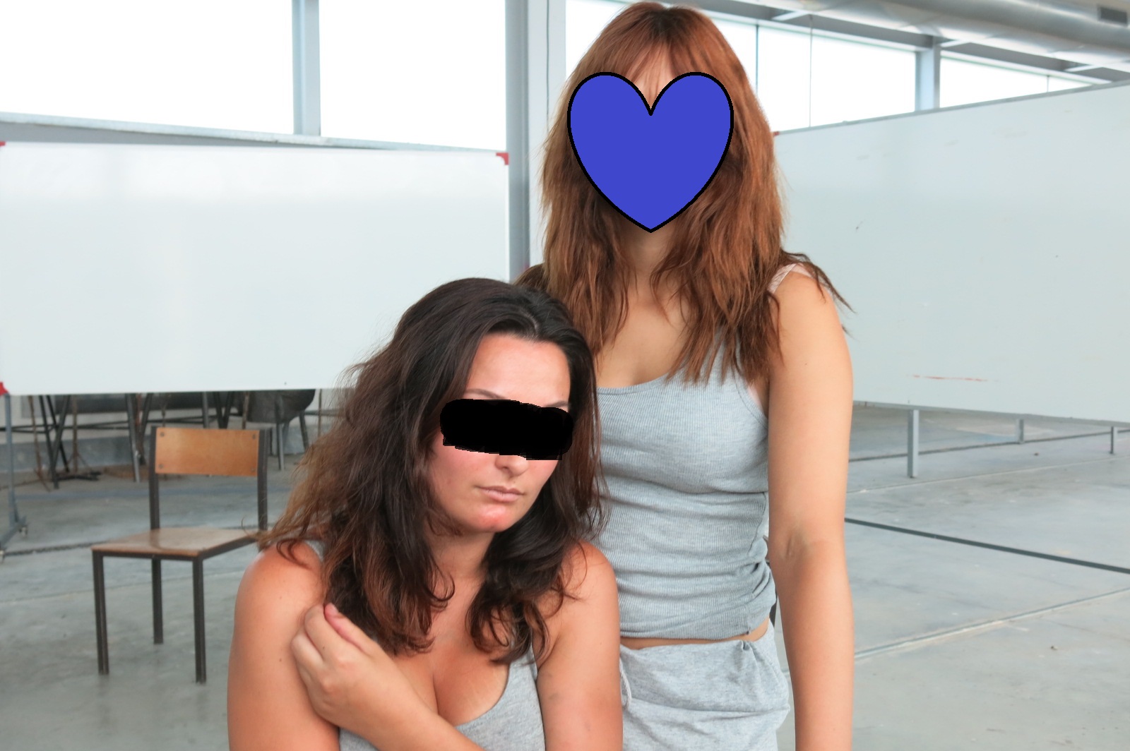 Eu (à esquerda) com a actriz que me ajudou. O ar de simplórias deve-se às personagens, ambas internadas numa clínica psiquiátrica após episódios traumáticos